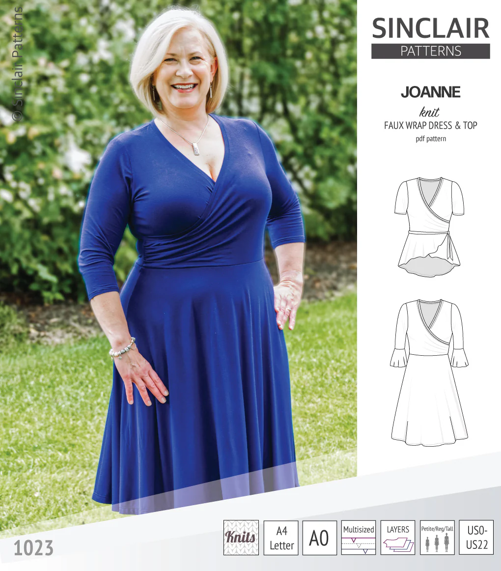 Featuring: fitted at the shoulders, bust and waist, with a flared skirt faux wrap knit dress with a pleated accent at the side seam. Medium depth modest neckline is finished with a band. Offered as a dress with a knee or midi length flared skirt or as a top with an overlapped peplum. Can be made as a sleeveless dress/top or with short, 3/4, long or elbow length sleeves with a flounce. Optional side pockets and simple waistline belt. The versatility of the pattern allows you to create a lot of different looks and variations for any occasion and any time of the year. Whether you want to create an evening dress, a night out fashionable top or a light summer dress we've got you covered with the Joanne faux wrap dress or top pattern.