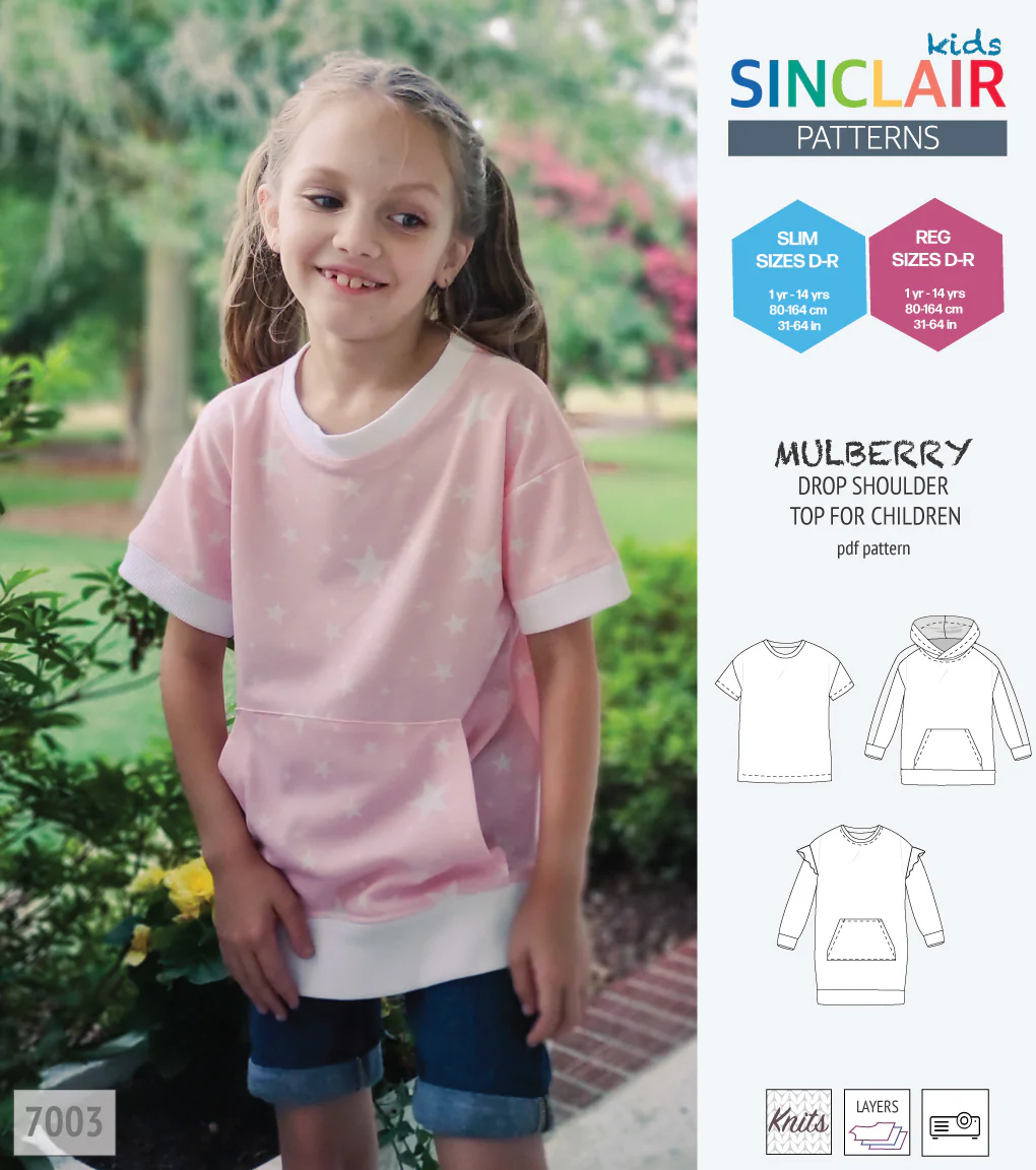 Featuring: relaxed at the shoulders, chest, waist and hips drop shoulder top for children designed for knit fabrics. Comes with an optional shoulder/arm color blocking insert, kangaroo pocket and gathered or simple sleeve flounce. The neckline can be finished with a regular neckline band (crew neck) or with a simple non lined hood. Sleeves come in long hemmed, long cuffed or short hemmed or banded. Can be finished as a hemmed or banded top or tunic.