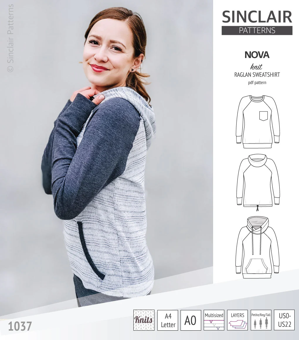 Featuring: relaxed at the shoulders, bust and waist, fitted at the hips (with the bottom band) or semi fitted at the hips (with the drawstrings) classic raglan sweatshirt. Offered with crew neck finished with a band, a medium sized lined cowl or overlapped lined hood. Sleeves are finished with fitted cuffs. Can have a chest patch pocket or a classic kangaroo pocket finished with bands. Very easy to make and a versatile sweatshirt that can be done in so many variations.
