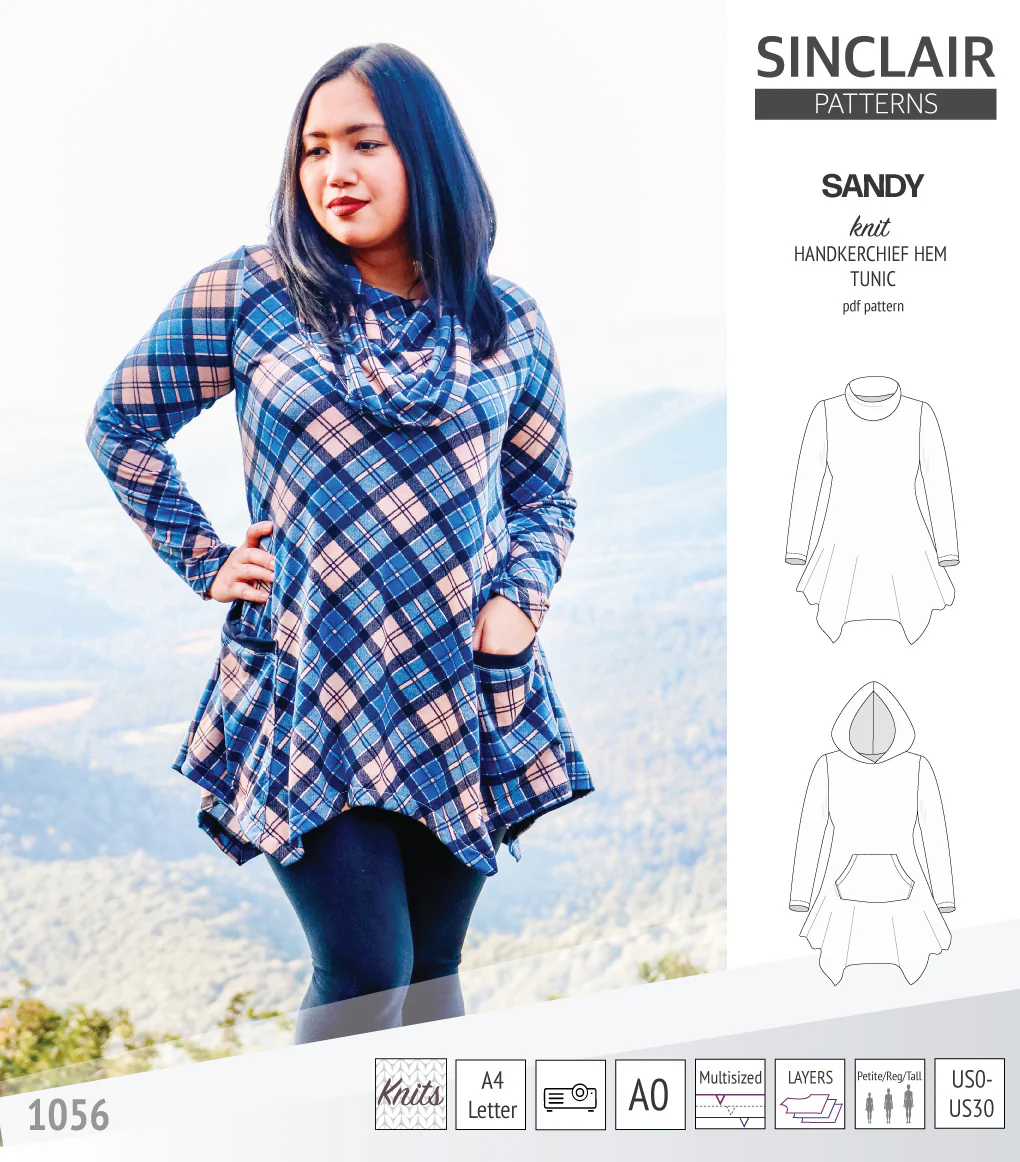 Featuring: flowing and feminine, easy to make and easy to wear knit tunic, slimming for almost any body shape. Fitted at the shoulders and at the bust, loose at the waist and flared at the hips, this tunic offers the best length for wearing with leggings and skinny jeans. Offered with a crew or scoop neckline finished with bands, turtleneck collar, cowl neck or an oversized hood, short, 3/4, long sleeves or sleeveless. Can have optional side patch pockets or central kangaroo pocket. Depending on your fabric choice can work as a winter sweater or a summer tunic.
