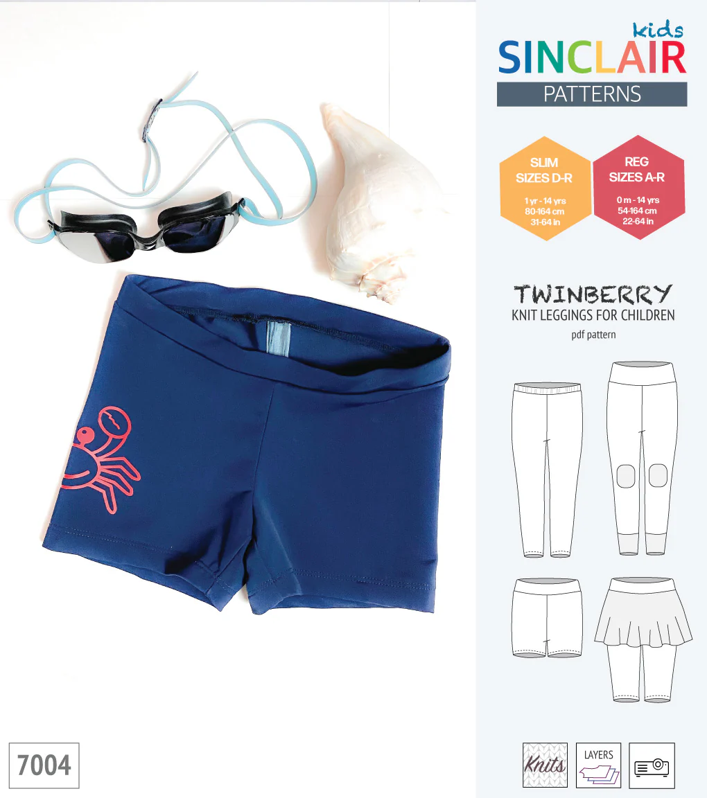 Fitted classic everyday leggings for children offered in full, capri and shorties lengths and can be finished with a regular elasticated or regular or tall yoga waistband. Legs might be finished with regular hems or cuffs. Optional 3/4 circle medium or short length skirt, with straight or hi-lo hem and attached to the waistline and optional knee patches.