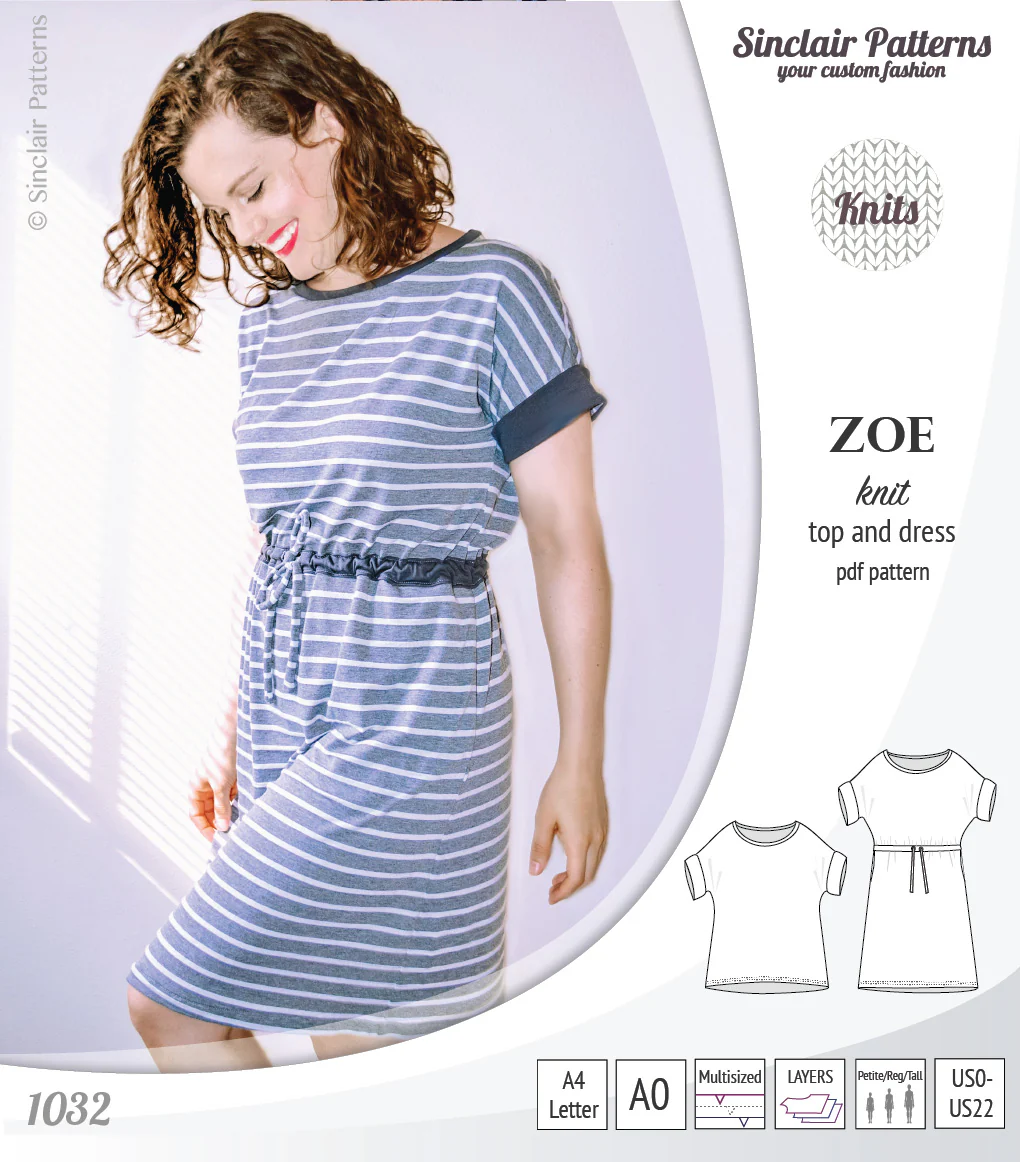 Featuring: very relaxed at the bust, waist and hips slightly oversized dolman top or drawstring top/dress designed for knit fabrics. Offered with short sleeves finished with rolled cuffs. Plain and drawstring top have a light hi-lo longline hem and a drawstring dress is just above the knee length. In seam pockets with dress version. Very comfortable and very fast to sew top or dress. Dress is perfect for border prints and stripes.